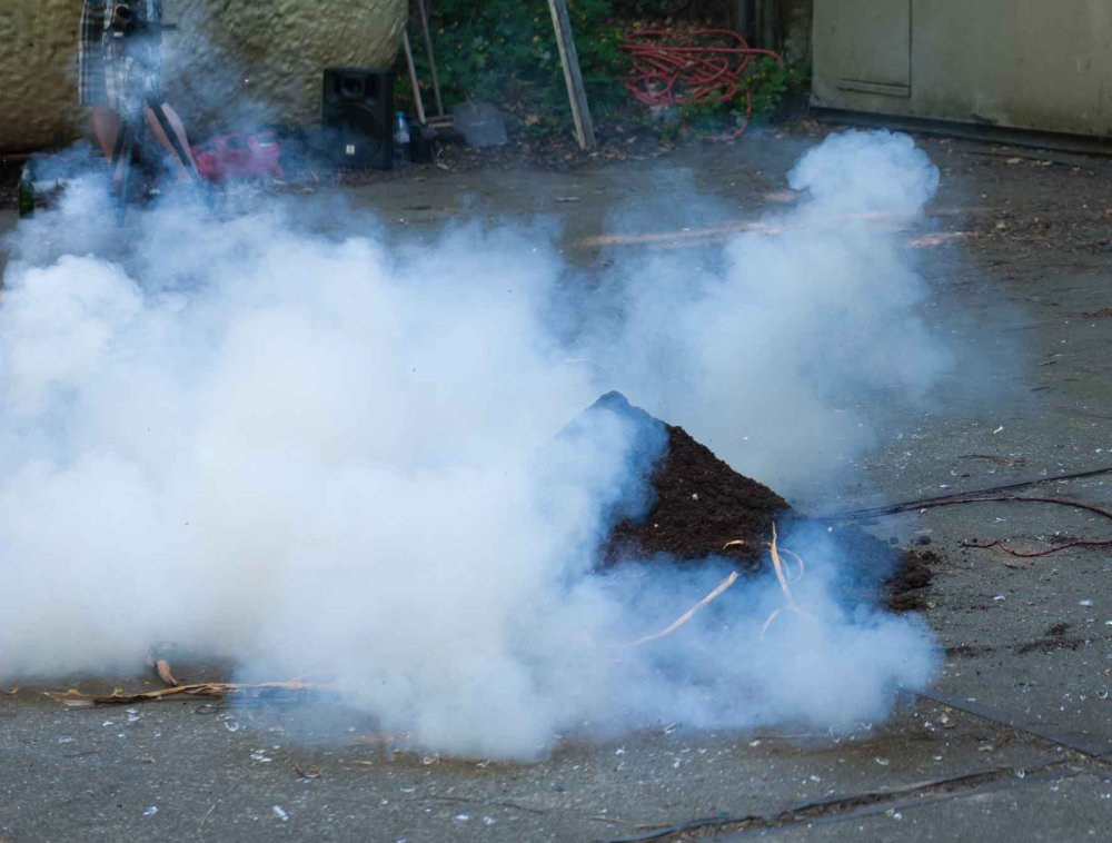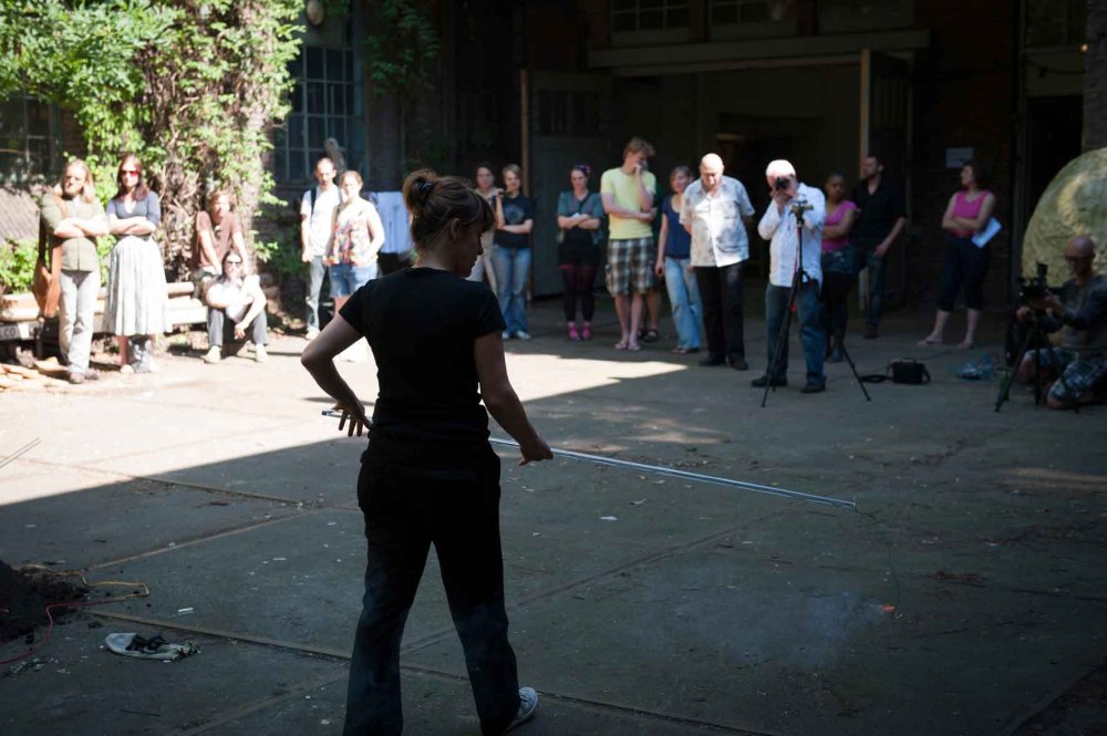 Performance avec tubes en verre, sons et mouvements, explosion de terre.