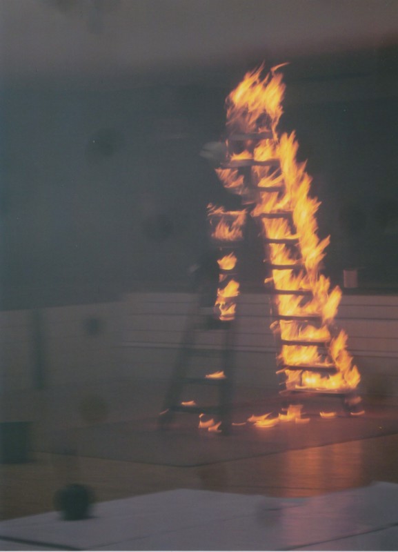 Sur une plateforme mobile. je peins une double échelle avec une pâte à feu transparente. l’échelle recouverte, j’enduis aussi le bout de mes bottes.
