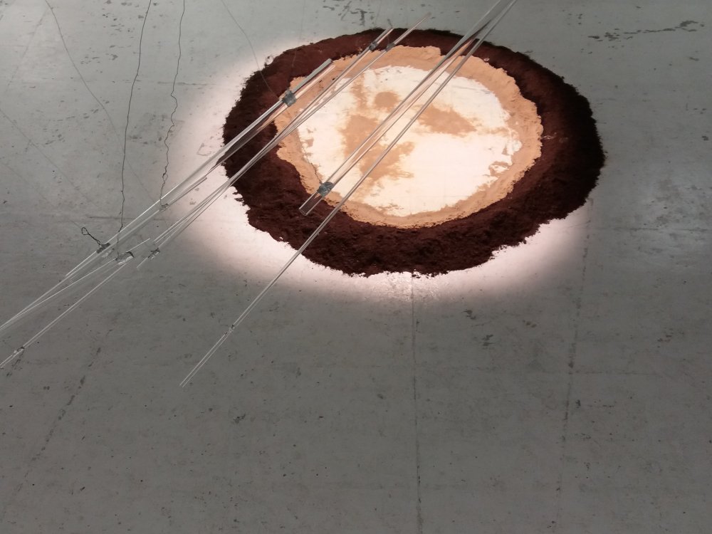 La gravitation, force responsable de la chute et du mouvement des corps célestes, a inspirée G.Robin pour mettre en dialogue l’espace de Passerelle Centre d’art contemporain avec les corps, les matériaux et la lumière en mouvement. Un paysage de matières en attente, évoquant des déserts terrestres et des espaces célestes.