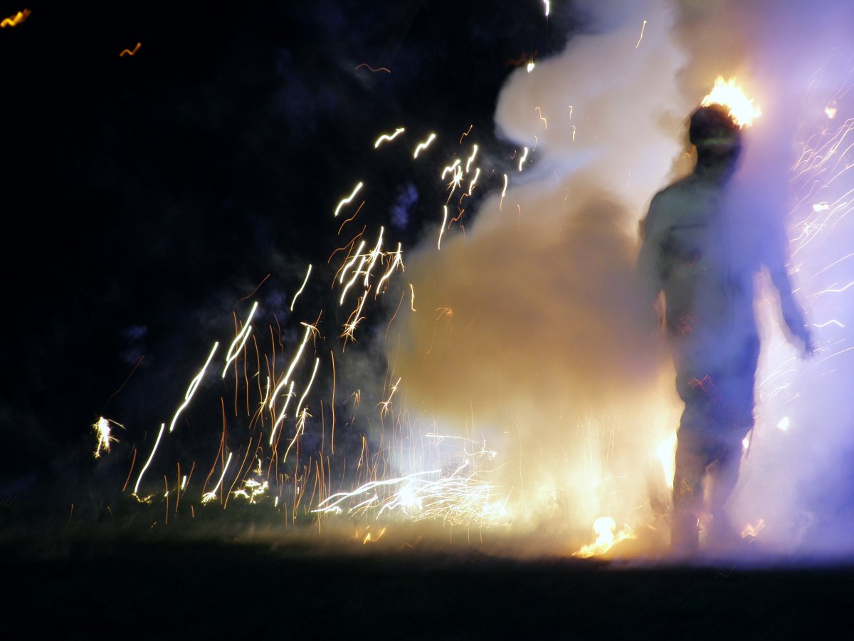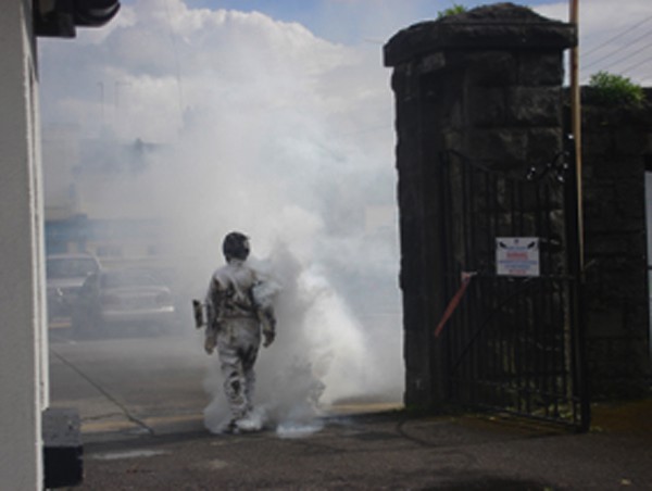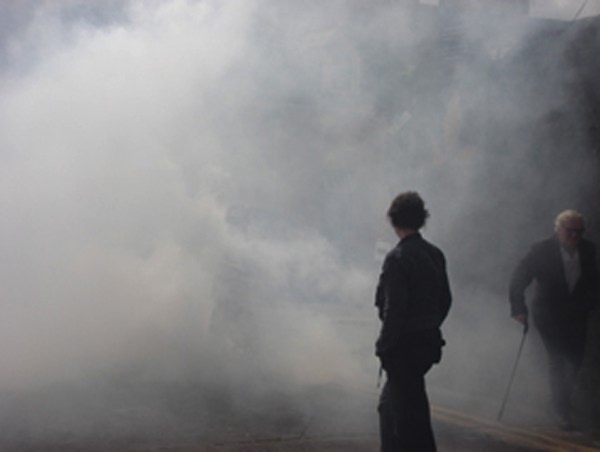 J’attache aux avant-bras et aux pieds, des capsules de fumigènes. je piège ma combinaison et casque de mèche explosive. J’allume une mèche lente qui après quarante secondes déclenche l’explosion sur ma combinaison et casque et simultanément allume toutes les capsules. J’apparais et disparais dans un nuage de fumée. Je marche lentement et déplace petit à petit le nuage.