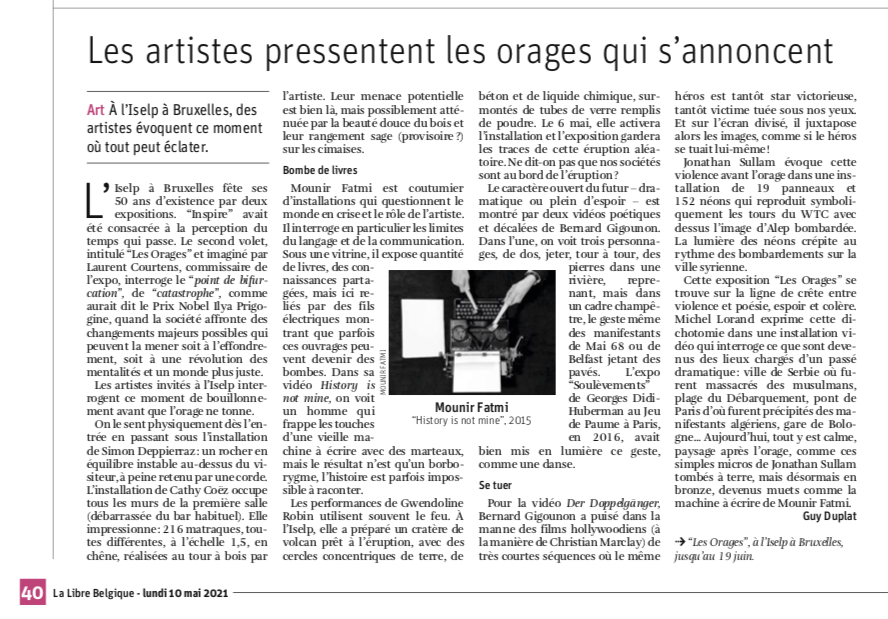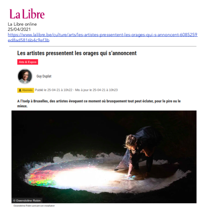 La Libre online- Guy Duplat - Les artistes pressentent les orages qui s’annoncent. 2021