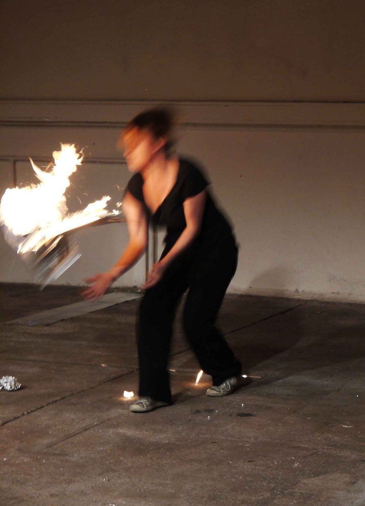 Performance avec tubes en verre et papier alumium, sons et mouvements.