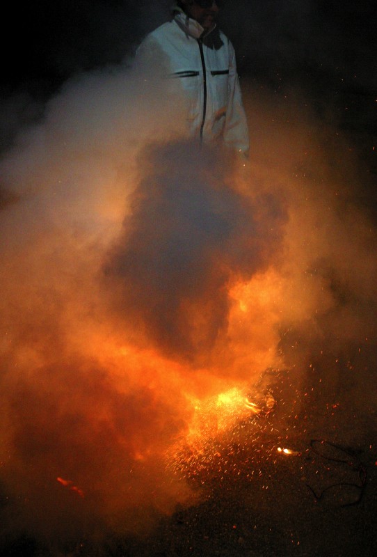 Je monte sur un petit tabouret. J’allume une mèche noire rapide qui déclenche l’allumage de toutes les capsules et fusées en même temps. Je cours ou marche pour tracer un sillage.