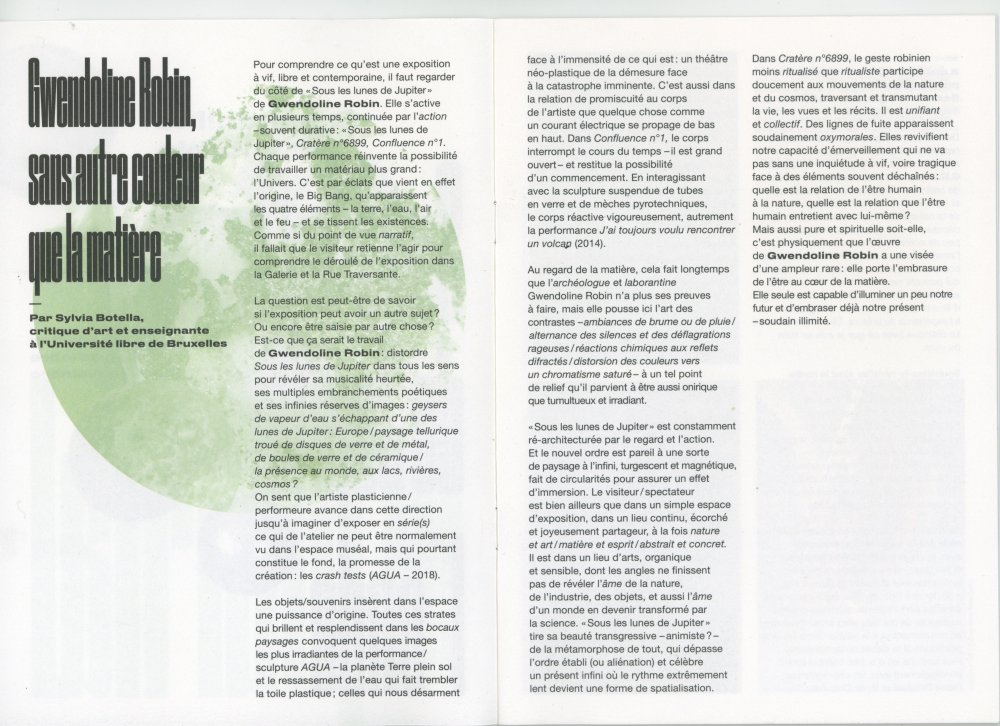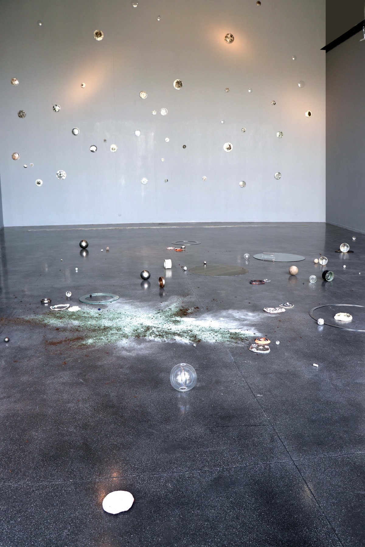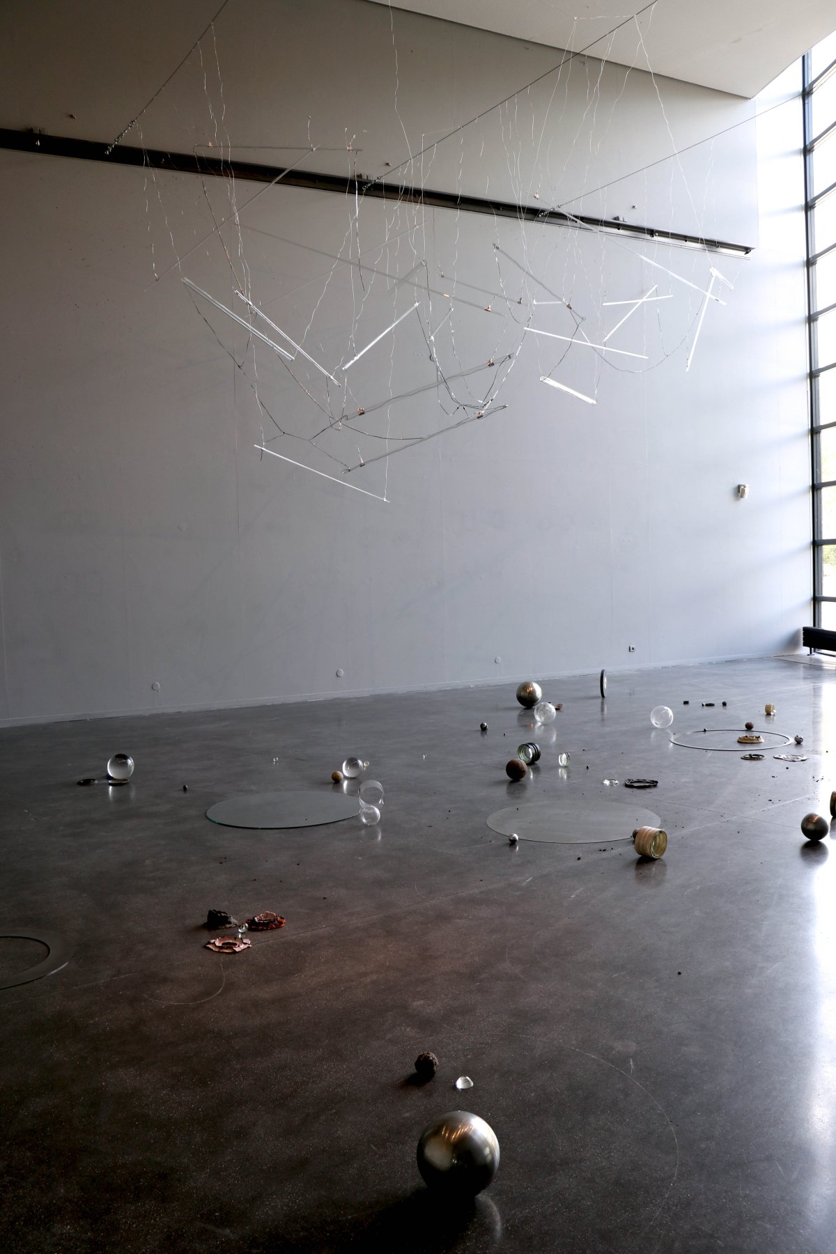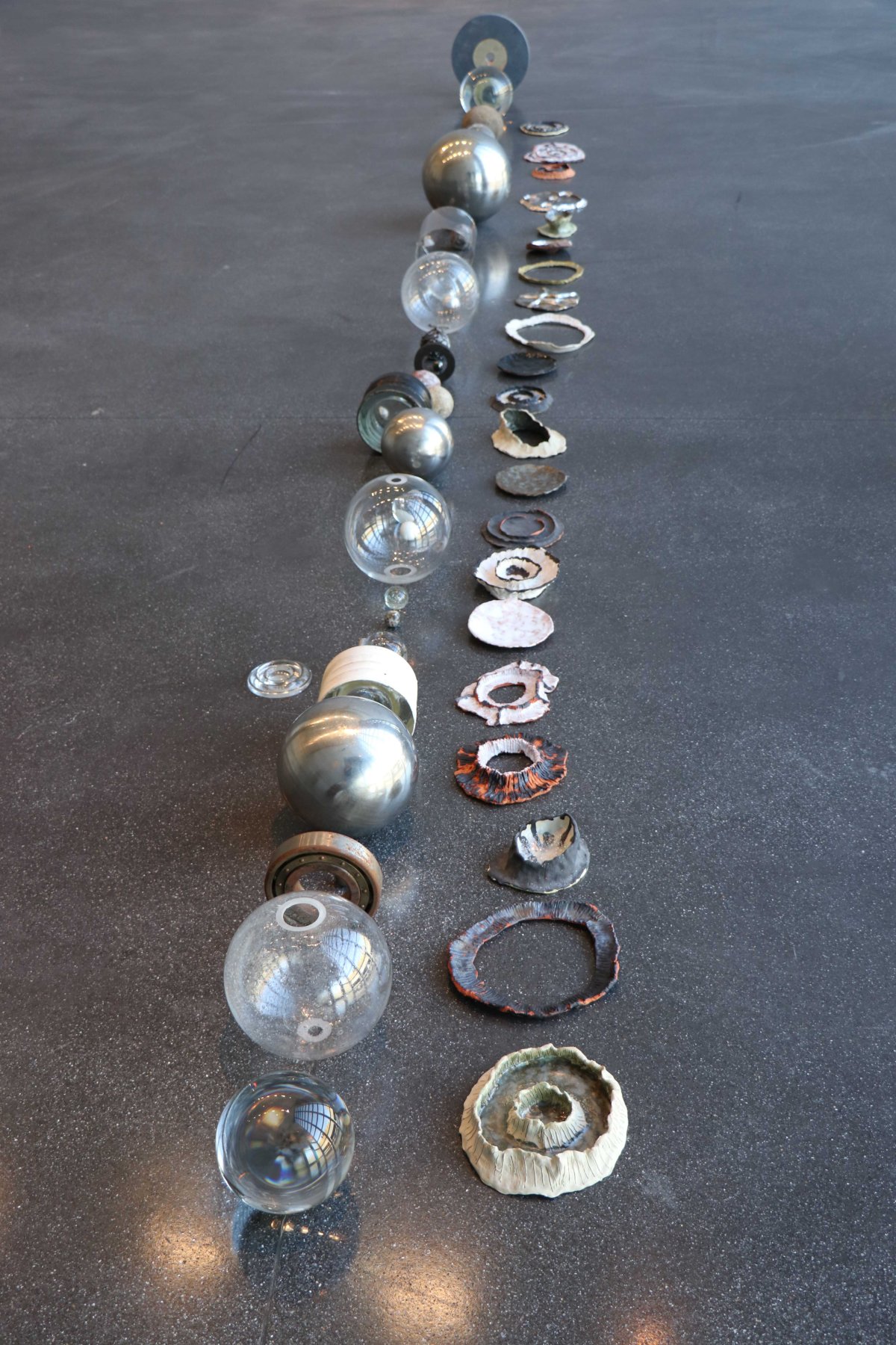 Les paysages de sels, les océans déchaînés, les mers congelées des lunes de Jupiter, les paysages arctiques, les mares acides, les carottes de glaces, les pluies de météorites inspirent Gwendoline Robin. Chez elle, rien n’est figé, tout est matière à manipulation, changement d’état, transformation soit liées au temps, soit par ses gestes. Ses œuvres, réalisées à partir de matériaux instables, constituent des actions, des processus qui rappellent ces paysages de climats extrêmes, ces lieux qui fascinent l’homme. Les différents espaces de l’Onde lui ont permis d’expérimenter les relations entre installations et performances, deux médiums qui ont chacun une temporalité particulière. Elle a pris la mesure de l’architecture particulière de ce lieu pour y installer ses pièces, du sol au plafond. Dans la galerie, au sol, divers objets sphériques de différentes dimensions et matières, récoltés et construits furent le point de départ d’une performance qui eu lieu le soir du vernissage. Ceux-ci font écho à l’installation au mur de lentilles de verre de formats variés, certaines récoltées et d’autres cuites dans des moules avec des métaux. La forme circulaire appelle à de multiples images, de l’infiniment petit à l’infiniment grand. Suspendue, une sculpture composée de tubes de verre sera aussi activée lors de la performance Confluence n°1. Dans la rue traversante, Cratère n°6899, dispositif sculptural offre d’abord une vision d’une eau dormante. Suite à une performance, cette œuvre se transformera au cours de l’exposition telle une matière vivante. L’élément eau se retrouve également au travers d’une ligne de bocaux, posés sur une étagère, montrant divers états de cette matière, solide et liquide. Cette présentation fait apparaître le dessin d’une chaine de montagnes. Ce qui crée un va-et-vient de la matière jusqu’au paysage. Ces correspondances incitent à se souvenir de phénomènes naturels observés, moments qui suscitent l’interrogation et le rêve. Les œuvres de Gwendoline Robin incarnent une certaine idée de l’Univers. Elle s’intéresse en effet à l’astronomie, étude de la galaxie et du cosmos et à la géologie, science qui explore la roche, les pierres et la structure du sol. De même, à travers la scénographie se révèle une relation entre la terre, le ciel et l’univers.