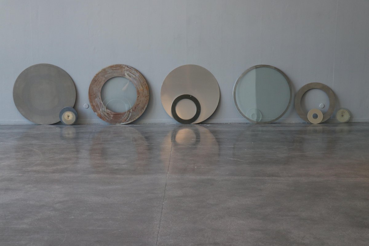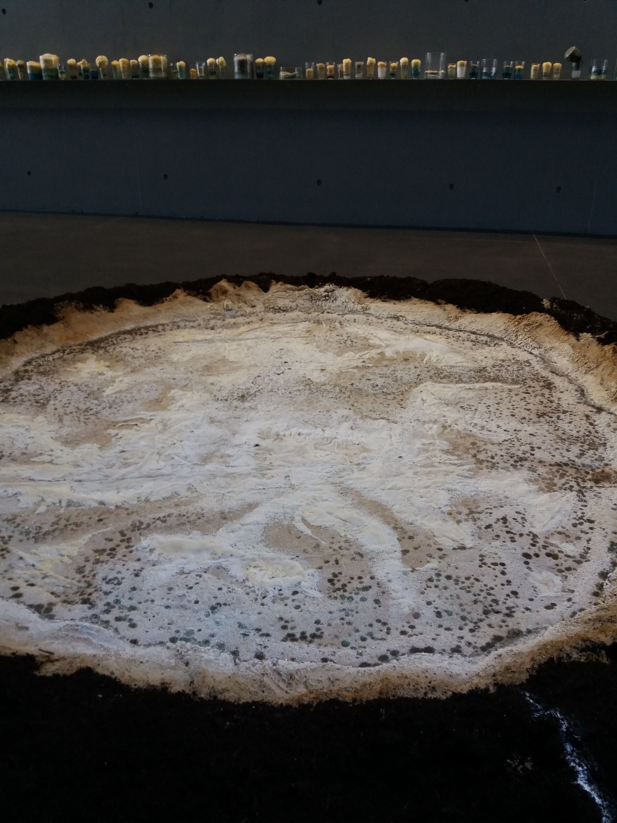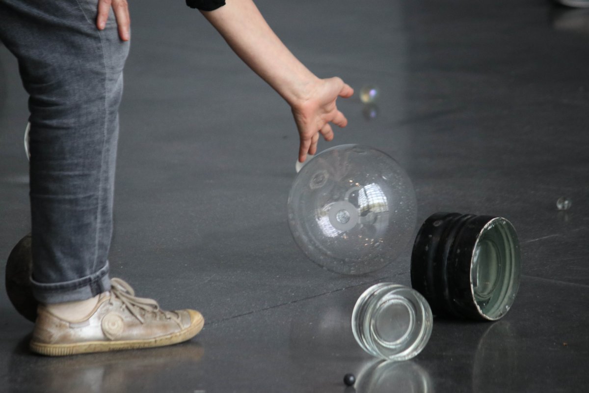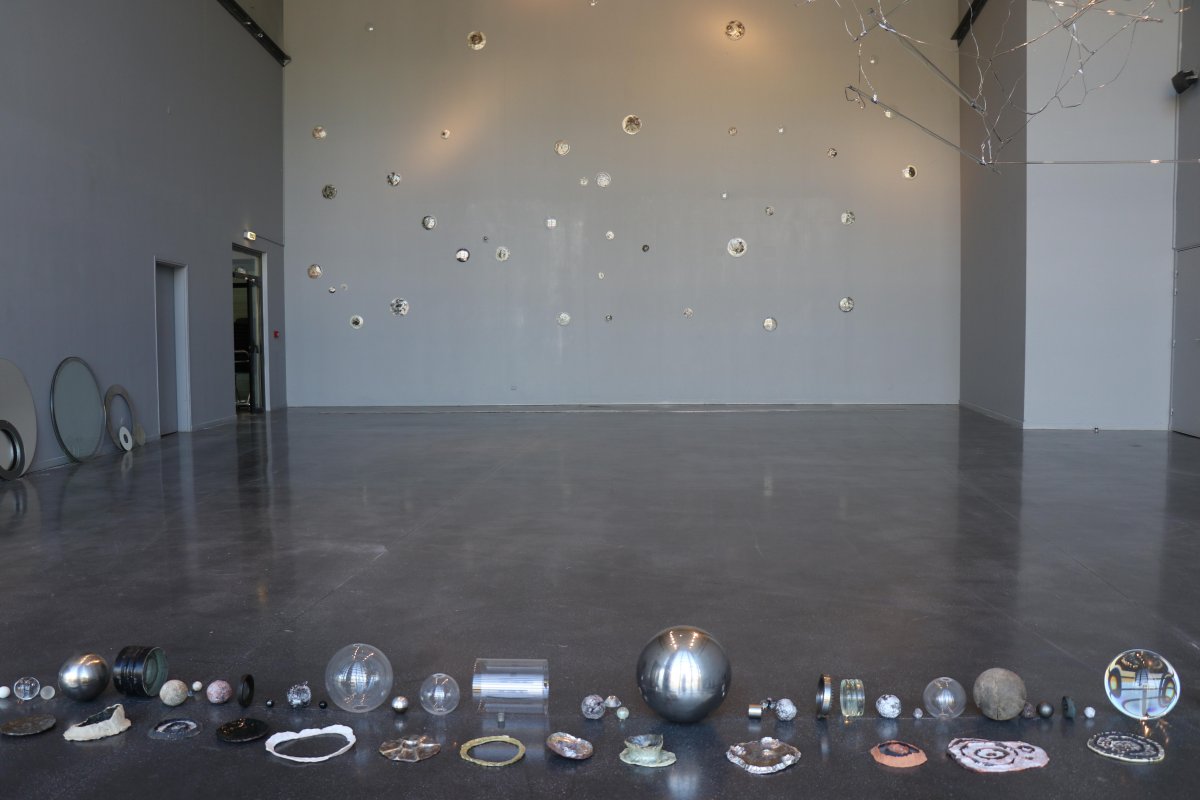 Les paysages de sels, les océans déchaînés, les mers congelées des lunes de Jupiter, les paysages arctiques, les mares acides, les carottes de glaces, les pluies de météorites inspirent Gwendoline Robin. Chez elle, rien n’est figé, tout est matière à manipulation, changement d’état, transformation soit liées au temps, soit par ses gestes. Ses œuvres, réalisées à partir de matériaux instables, constituent des actions, des processus qui rappellent ces paysages de climats extrêmes, ces lieux qui fascinent l’homme. Les différents espaces de l’Onde lui ont permis d’expérimenter les relations entre installations et performances, deux médiums qui ont chacun une temporalité particulière. Elle a pris la mesure de l’architecture particulière de ce lieu pour y installer ses pièces, du sol au plafond. Dans la galerie, au sol, divers objets sphériques de différentes dimensions et matières, récoltés et construits furent le point de départ d’une performance qui eu lieu le soir du vernissage. Ceux-ci font écho à l’installation au mur de lentilles de verre de formats variés, certaines récoltées et d’autres cuites dans des moules avec des métaux. La forme circulaire appelle à de multiples images, de l’infiniment petit à l’infiniment grand. Suspendue, une sculpture composée de tubes de verre sera aussi activée lors de la performance Confluence n°1. Dans la rue traversante, Cratère n°6899, dispositif sculptural offre d’abord une vision d’une eau dormante. Suite à une performance, cette œuvre se transformera au cours de l’exposition telle une matière vivante. L’élément eau se retrouve également au travers d’une ligne de bocaux, posés sur une étagère, montrant divers états de cette matière, solide et liquide. Cette présentation fait apparaître le dessin d’une chaine de montagnes. Ce qui crée un va-et-vient de la matière jusqu’au paysage. Ces correspondances incitent à se souvenir de phénomènes naturels observés, moments qui suscitent l’interrogation et le rêve. Les œuvres de Gwendoline Robin incarnent une certaine idée de l’Univers. Elle s’intéresse en effet à l’astronomie, étude de la galaxie et du cosmos et à la géologie, science qui explore la roche, les pierres et la structure du sol. De même, à travers la scénographie se révèle une relation entre la terre, le ciel et l’univers.