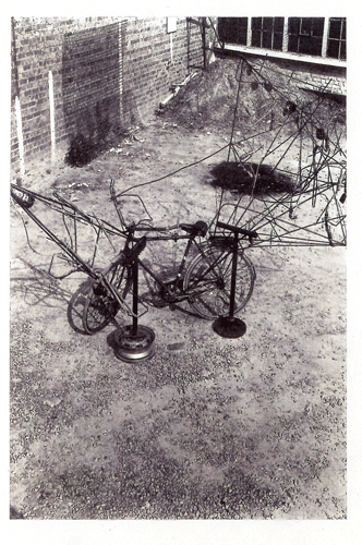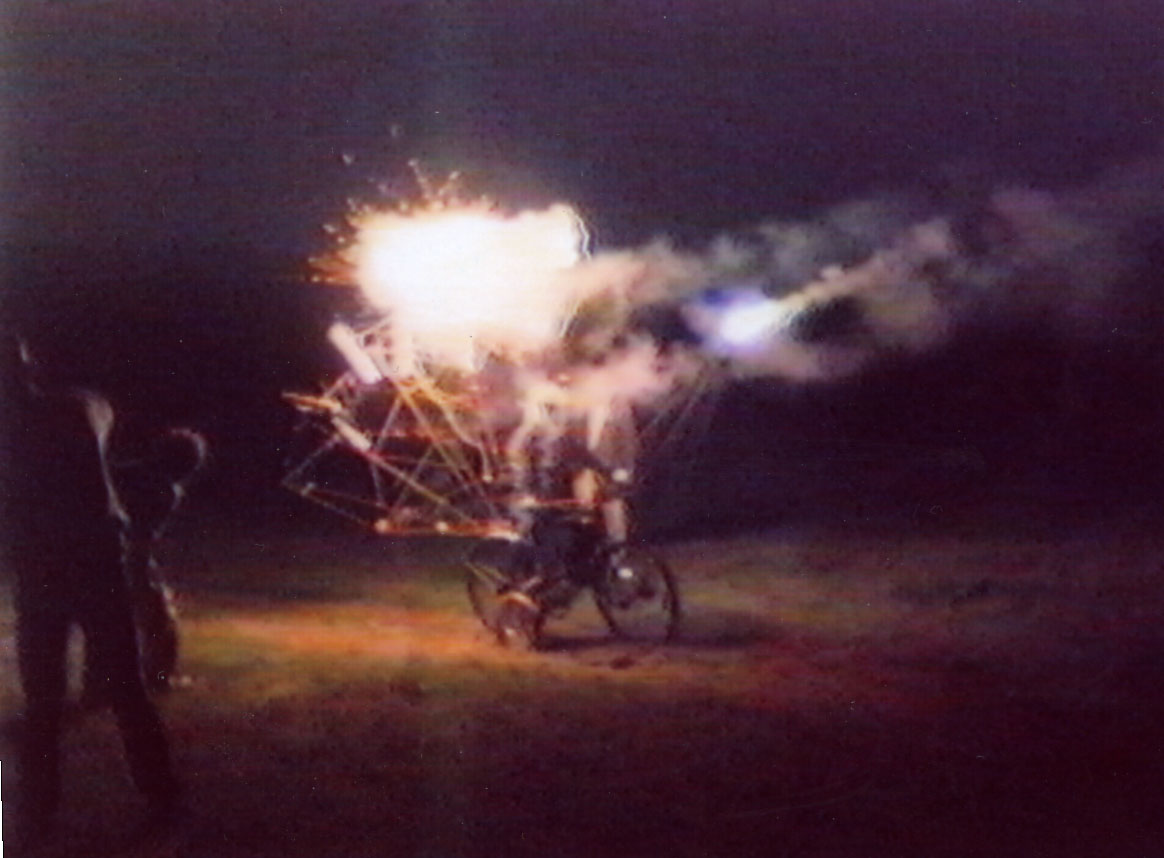 J’ai augmenté mon vélo d’une structure métallique, sur laquelle j’ai attaché des effets pyrotechniques. Lorsque je roule avec ce vélo, j’allume les effets pour tenter d’aller plus vite par propulsion.