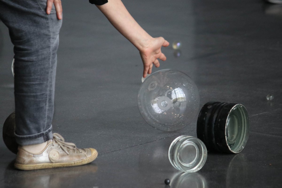 Une performance qui entrelace mouvements et résonances de matériaux. Un ensemble hétéroclite, de sphères, disques, anneaux de différentes dimensions et matières instables sont manipulés par la performeuse. Un paysage jupitérien se compose puis se transforme progressivement au rythme des gestes et de la matière sonore provoquée par les rencontres impromptues des matériaux.